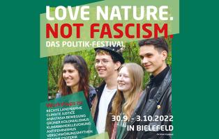 Das Politik-Festival „Love Nature. Not Fascism.“ bringt junge ökologisch und politisch engagierte Menschen zwischen 16 und 26 Jahren aus ganz Deutschland zusammen. Zahlreiche Workshops und Vorträge bieten die Möglichkeit, sich intensiv mit dem Themenfeld „Naturschutz, Umweltschutz und Rechtsextremismus“ auseinanderzusetzen. Mit dem erworbenen Wissen kann antidemokratischer Natur- und Umweltschutz im eigenen Umfeld rechtzeitig identifiziert werden.