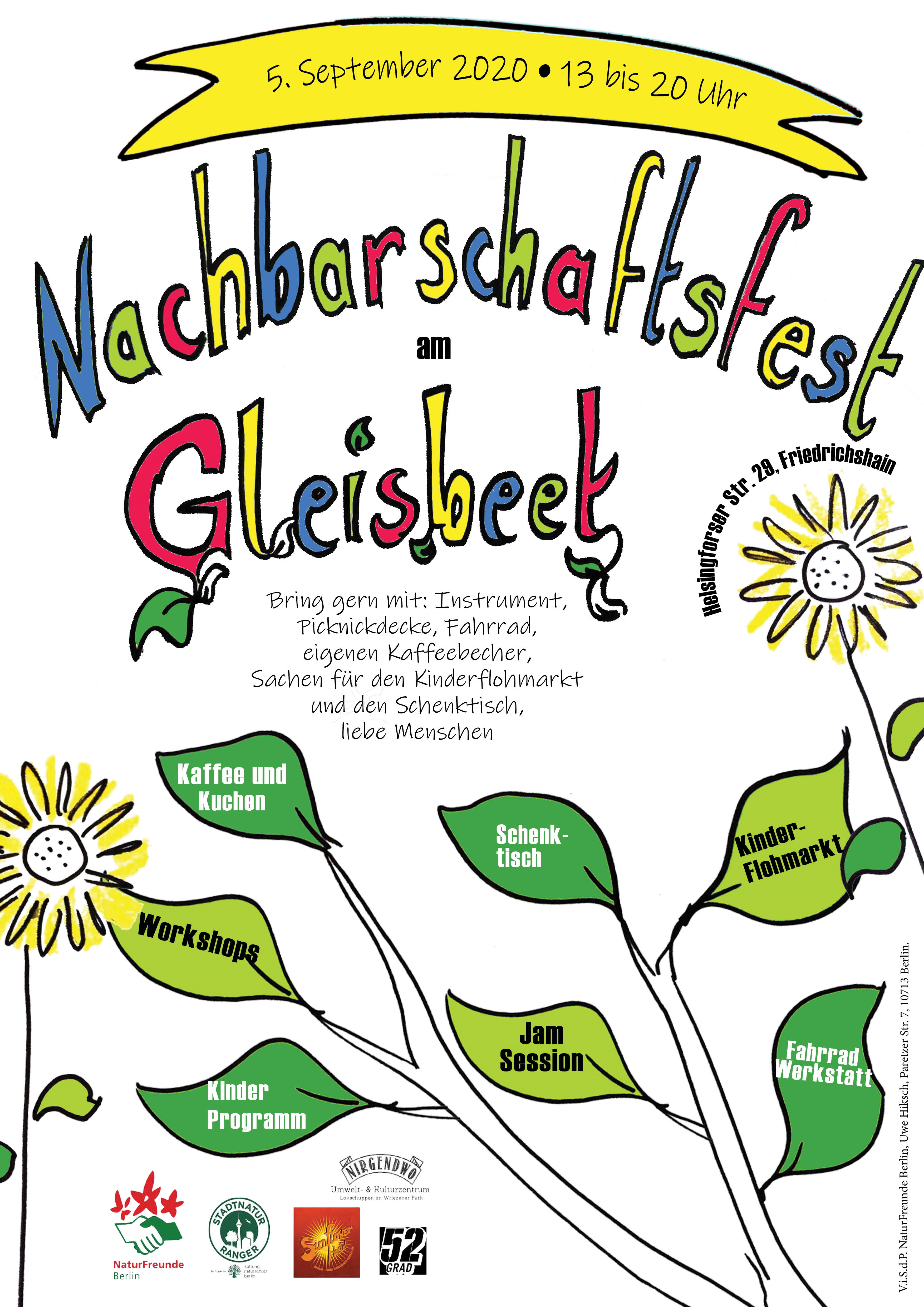 Das Nachbarschaftsfest findet im Wriezener Park im GleisBeet, Helsingforser Str. 29, 10243 Berlin statt. Das Fest wird in Kooperation mit dem Umwelt- und Kulturzentrum Nirgendwo, den Stadtnatur Rangern, dem Sunflower Hostel und 52 Grad organisiert.