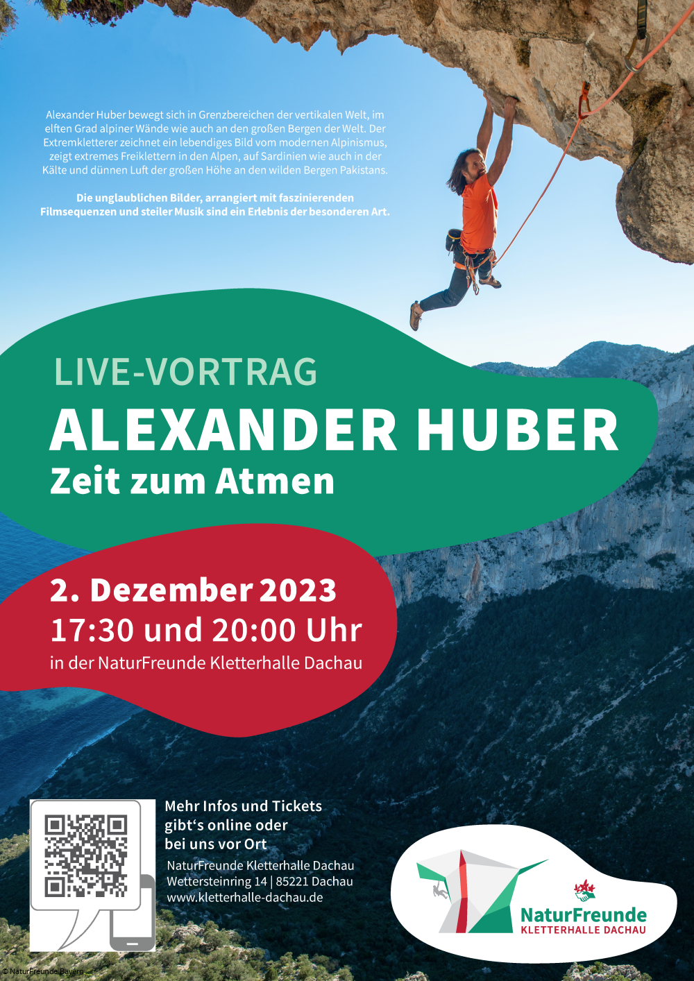 wir konnten für unsere Kletterhalle Dachau einen ganz besonderen Gast gewinnen. Alexander Huber von den „Huberbuam“ hält am 2. Dezember einen Live-Vortrag unter dem Motto „Zeit zum Atmen“. Er ist deutscher Profilbergsteiger und Extremkletterer und widmet sich ganz dem Extremalpinismus. Er zählt inzwischen zu den erfolgreichsten Allroundbergsteigern.